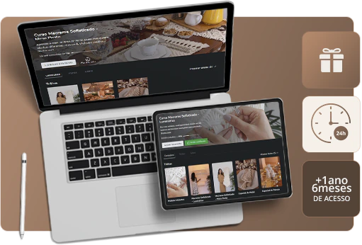 Ganham acesso ao curso Macramê Sofisticado Cadeiras + 1 ano a mais de acesso em cada curso (totalizando 2 anos de acesso nos 3 cursos: curso Macramê Sofisticado Mesa Posta, curso Macramê Sofisticado Cadeiras e curso Macramê Sofisticado Luminárias).