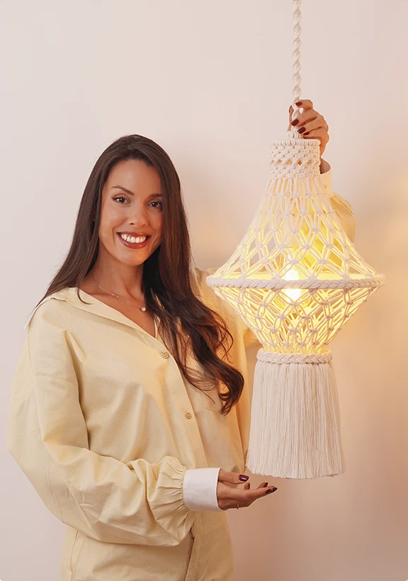 Em apenas três aulas práticas, você vai criar sua primeira luminária de macramê sofisticado, entender os detalhes que valorizam uma peça e se surpreender com o resultado.